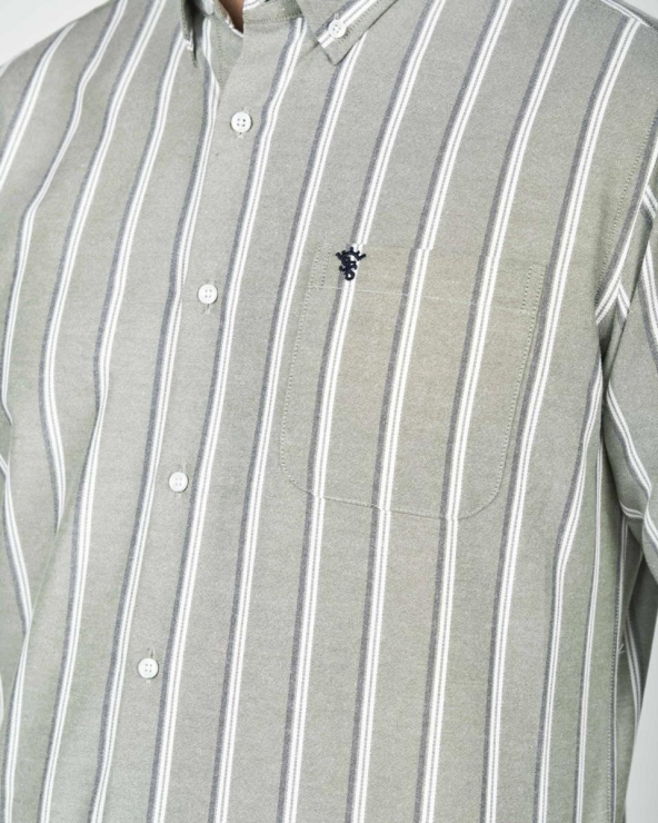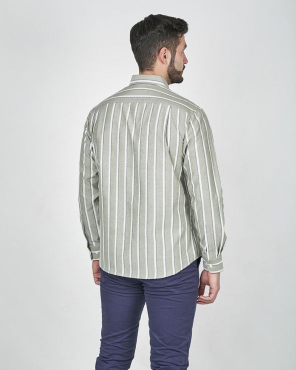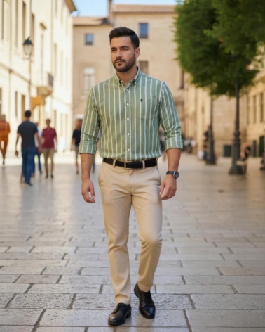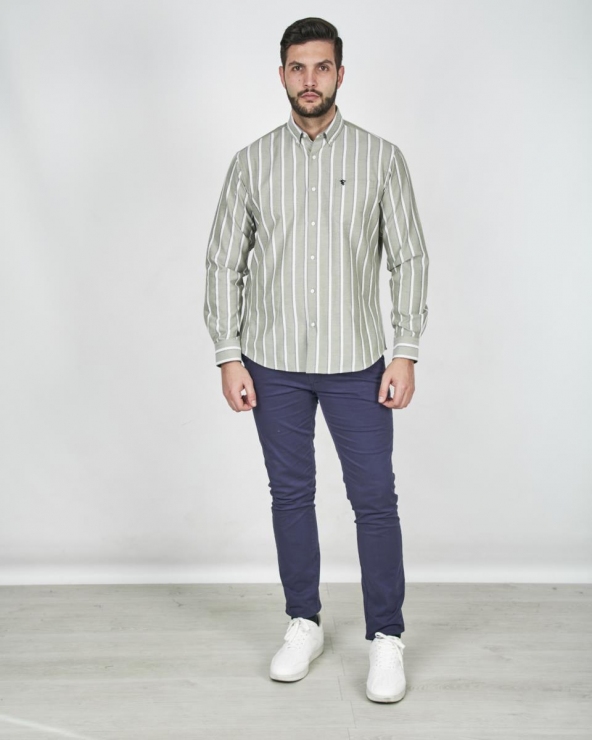 Esta camisa de hombre es una prenda versátil y cómoda. perfecta para looks casuales. de fin de semana o de oficina informal. Confeccionada en el clásico tejido Oxford. conocido por su textura distintiva y su durabilidad. presenta un patrón de rayas que estilizan y alargan visualmente la figura. y además. aportan facilidad de combinación.