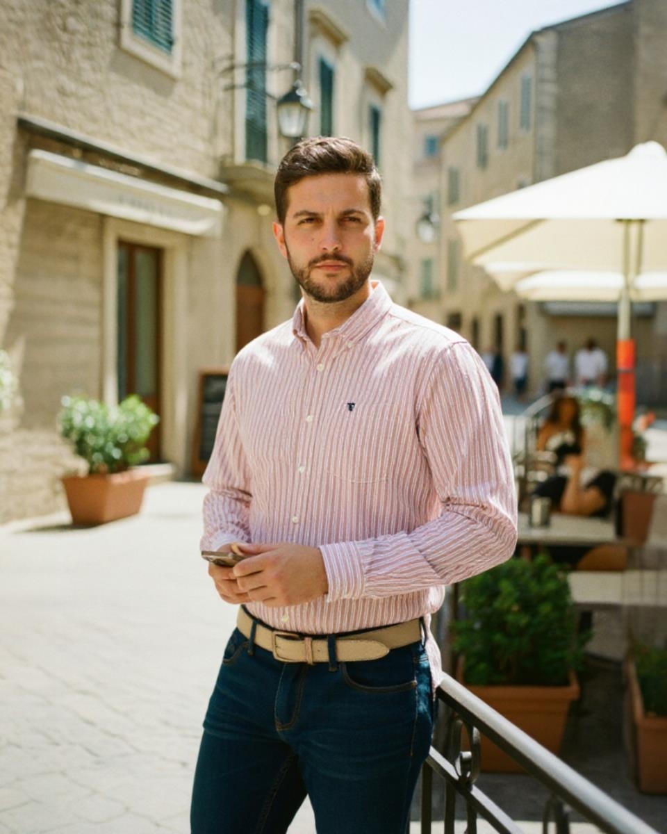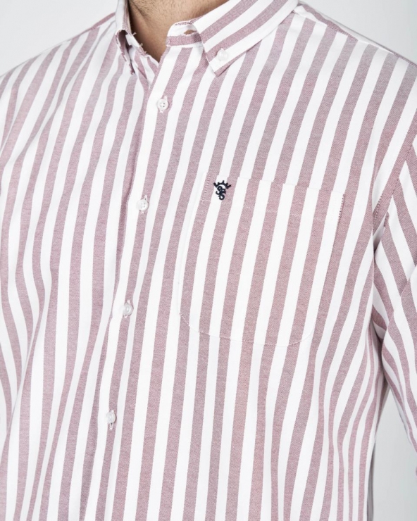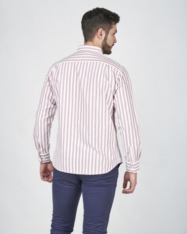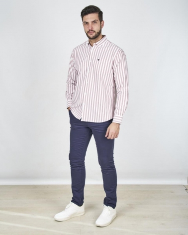 Esta camisa de hombre es una prenda versátil y cómoda. perfecta para looks casuales. de fin de semana o de oficina informal. Confeccionada en el clásico tejido Oxford. conocido por su textura distintiva y su durabilidad. presenta un patrón de rayas que estilizan y alargan visualmente la figura. y además. aportan facilidad de combinación.