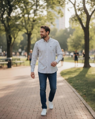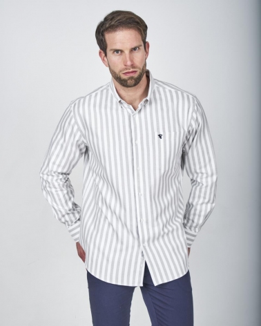 Esta camisa de hombre es una prenda versátil y cómoda. perfecta para looks casuales. de fin de semana o de oficina informal. Confeccionada en el clásico tejido Oxford. conocido por su textura distintiva y su durabilidad. presenta un patrón de rayas que estilizan y alargan visualmente la figura. y además. aportan facilidad de combinación.
