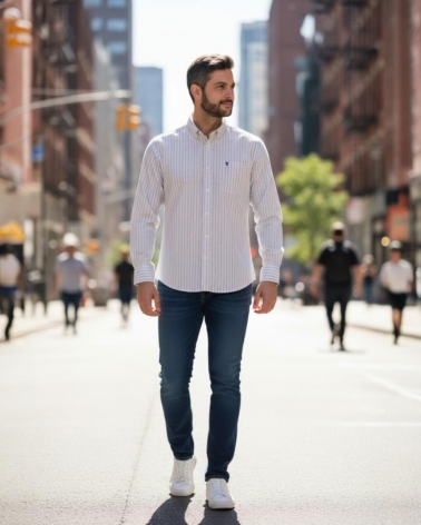 Esta camisa de hombre es una prenda versátil y cómoda. perfecta para looks casuales. de fin de semana o de oficina informal. Confeccionada en el clásico tejido Oxford. conocido por su textura distintiva y su durabilidad. presenta un patrón de rayas que estilizan y alargan visualmente la figura. y además. aportan facilidad de combinación.