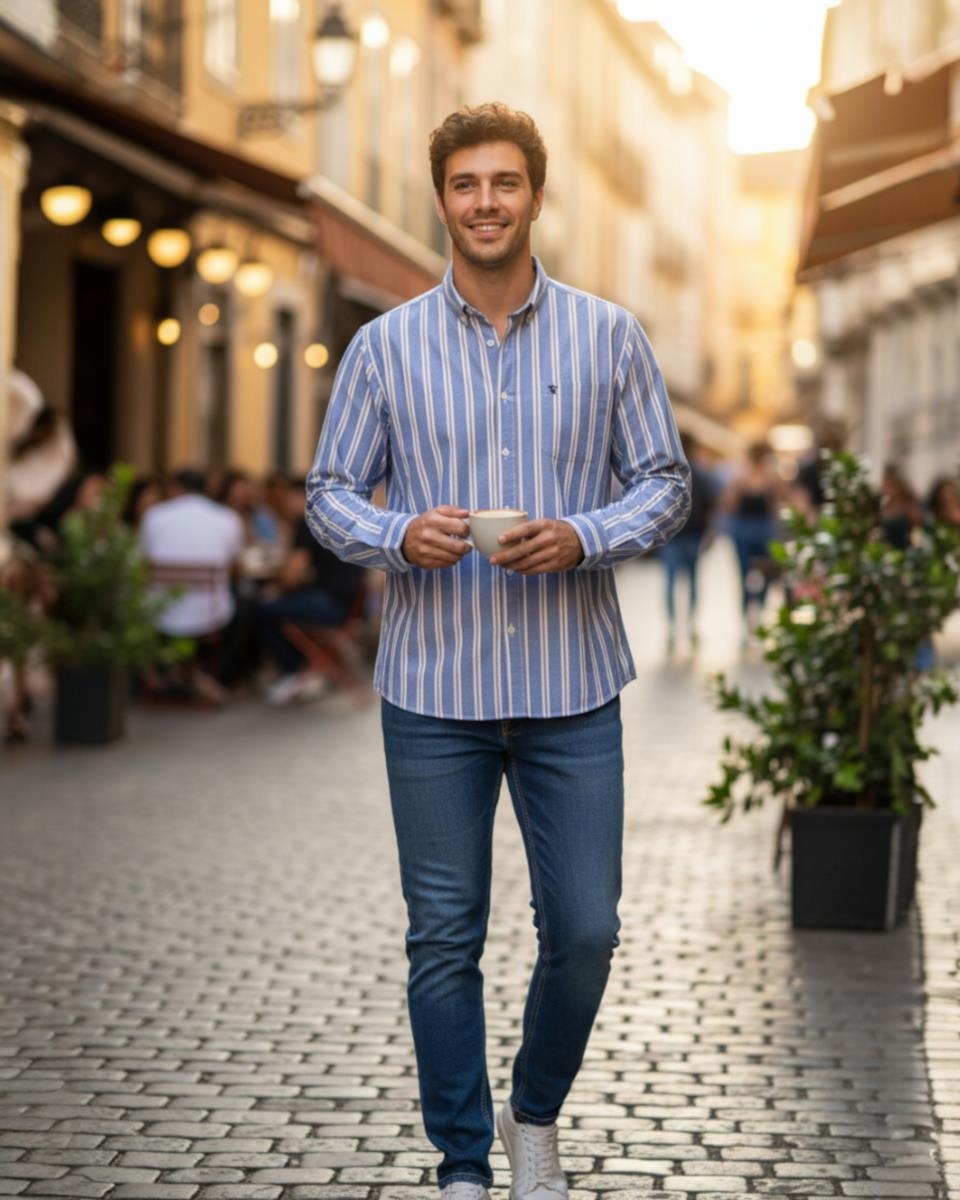 Esta camisa de hombre es una prenda versátil y cómoda. perfecta para looks casuales. de fin de semana o de oficina informal. Confeccionada en el clásico tejido Oxford. conocido por su textura distintiva y su durabilidad. presenta un patrón de rayas que estilizan y alargan visualmente la figura. y además. aportan facilidad de combinación.