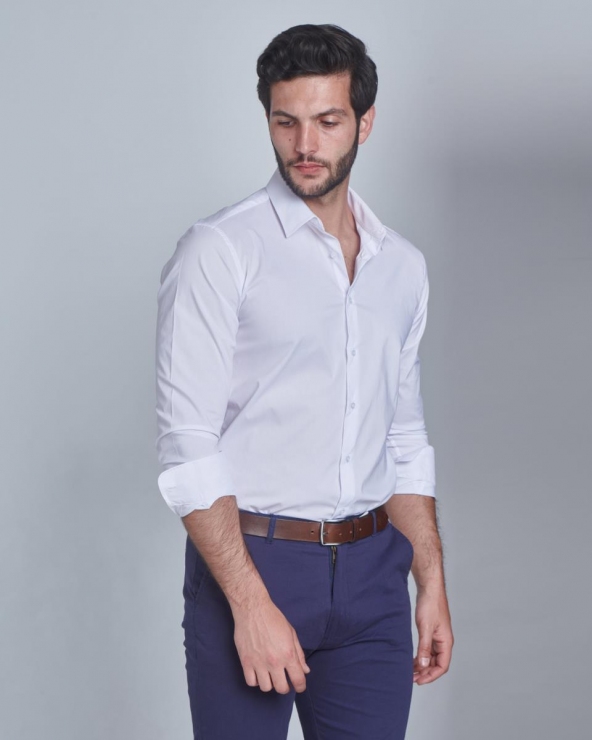 Camisa de cuello italiano. vestir. de color liso en tejido popelín elastano. sin bolsillo ni logo en el pecho. Patrón semientallado elástico.