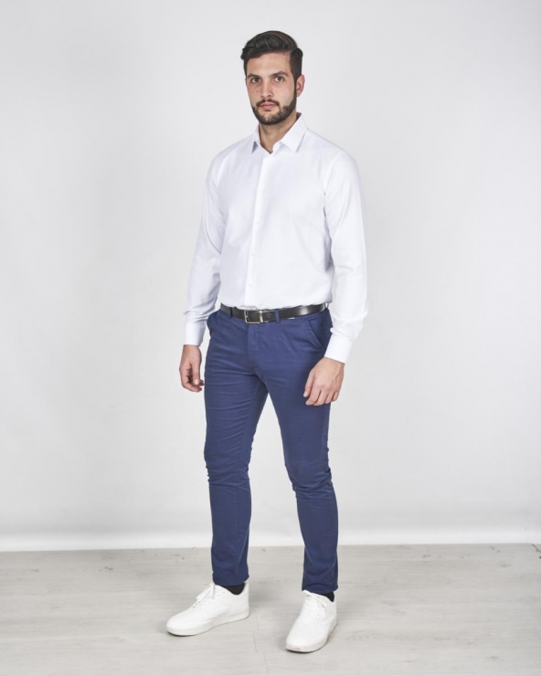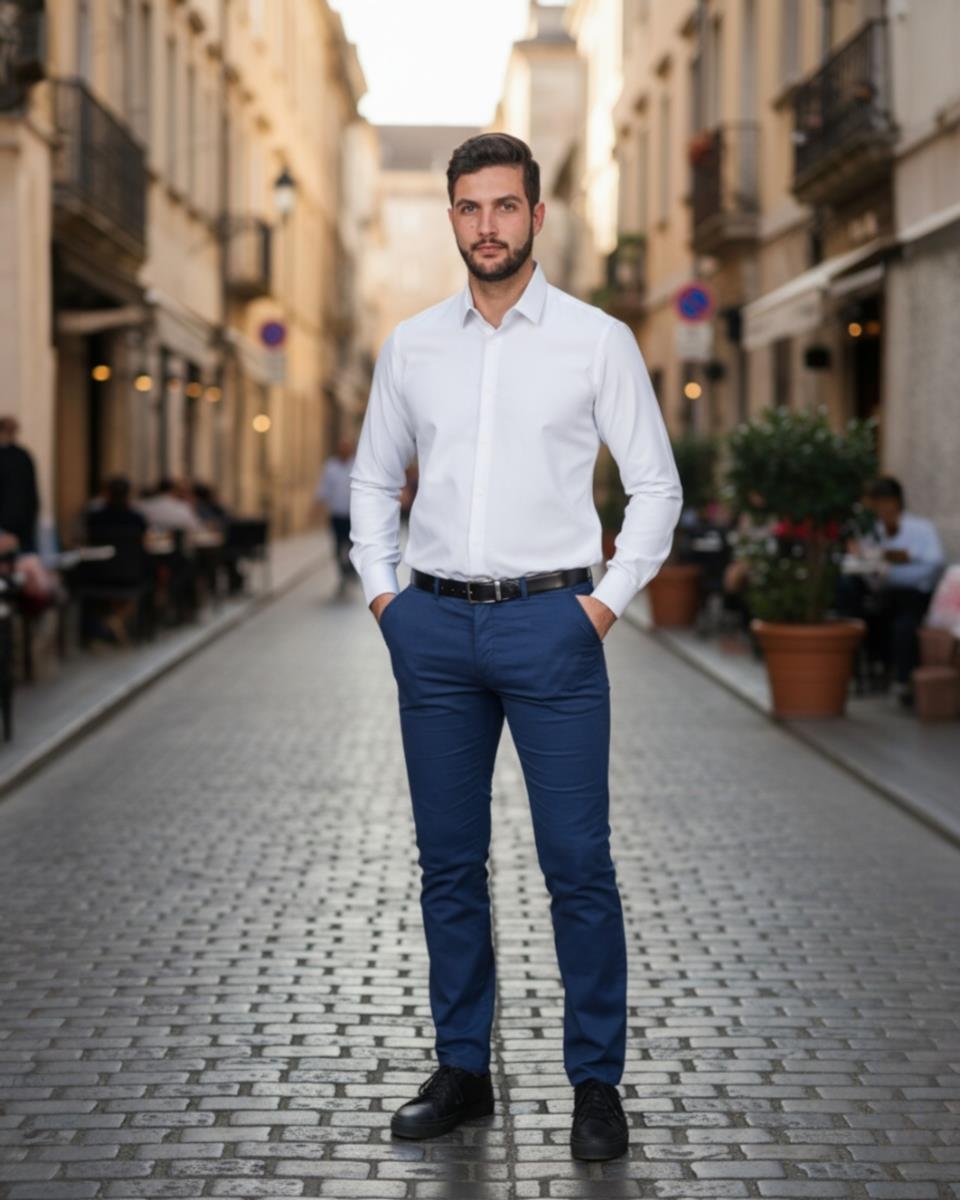 • Corte Semi-Slim Ajuste Moderno: Un corte ligeramente entallado que se ajusta al cuerpo sin ser demasiado ceñido. ofreciendo una silueta moderna. definida y profesional.