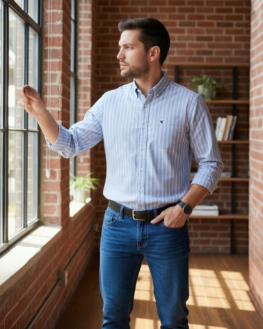 Esta camisa de hombre es una prenda versátil y cómoda. perfecta para looks casuales. de fin de semana o de oficina informal. Confeccionada en el clásico tejido Oxford. conocido por su textura distintiva y su durabilidad. presenta un patrón de rayas que estilizan y alargan visualmente la figura. y además. aportan facilidad de combinación.