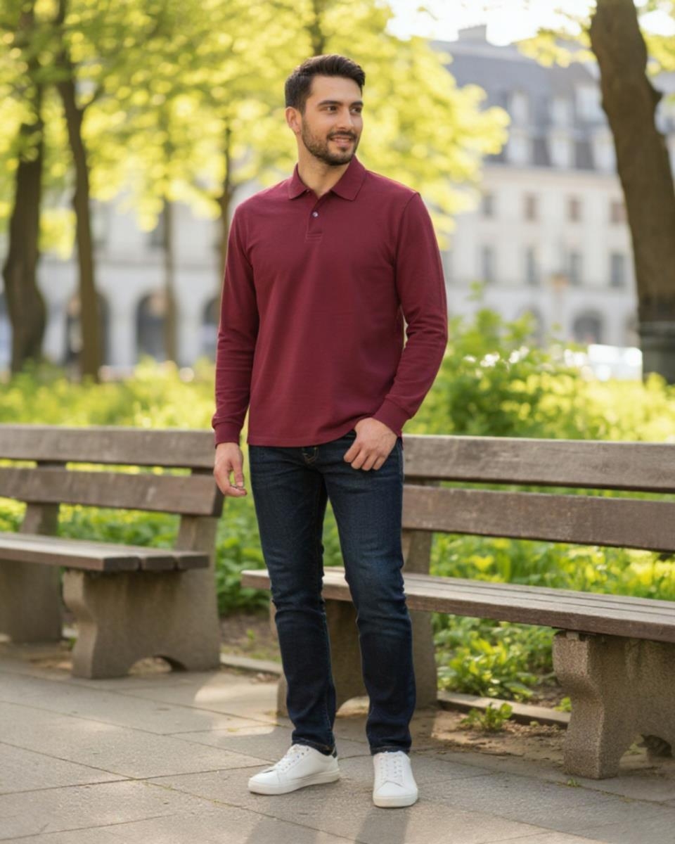Este polo de manga larga es una pieza esencial para el vestuario de entretiempo y otoño/invierno. Confeccionado en suave tejido de Punto Liso (Single Jersey), ofrece la comodidad de una camiseta y la estructura de un polo. Es elegante y fácil de combinar, proporcionando un look pulcro y smart-casual.